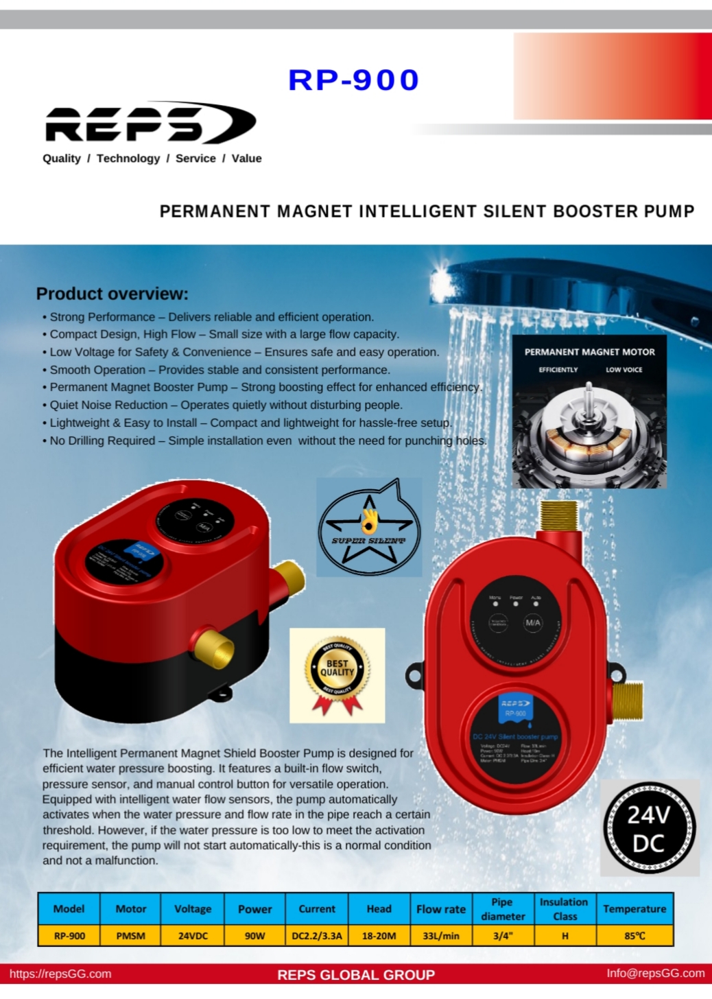 پمپ آب داخل واحدی مدل RSP900 به سفارش کمپانی رپس گلوبال انگلیس برای واحد های ساختمانی و منازلی ساخته شده که با مشکل کمبود فشار آب دست و پنجه نرم می کنند. این پمپ آب به نحوی طراحی شده که افزایش فشار آب را برای منازلی که دارای فشار آب کم هستند، (به دلیل نبود پمپ آب ساختمان یا ضعیف بودن آن ) فراهم می کند. از ویژگی های مهم این دستگاه به ولتاژ آن می توان اشاره کرد که 24 ولت بوده و لذا خطر برق گرفتگی را برای محیط های مرطوب تا حد زیادی کاهش می دهد. این پمپ در دسته پمپ های زیر پکیجی یا آبگرمکنی جای می گیرد. اگرچه این پمپ ها معمولاً برای ورودی آب سرد ساختمان یا قبل از آبگرمکن استفاده می شوند، اما امکان استفاده برای افرادی که از مشکل کمبود فشار آب گرم موتورخانه در منزل خود رنج می برند نیز وجود دارد که آن را از تمامی پمپ های آبگرمکنی مرسوم در بازار که تنها برای آب سرد توصیه می شوند، متمایز ساخته است.
