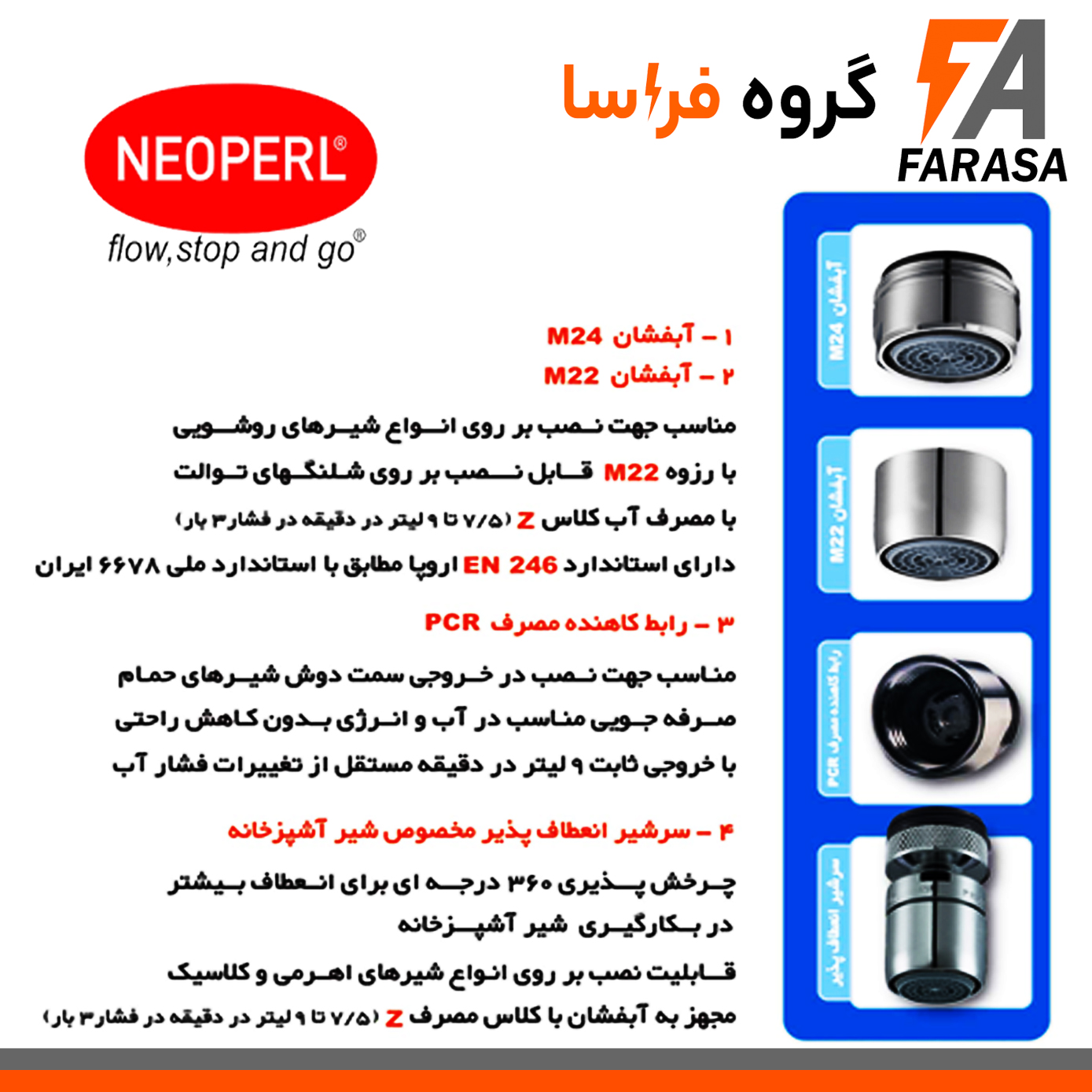 با بسته کاهنده مصرف آب نئوپرل، مصرف آب خود را بهینه کنید و در هزینهها صرفهجویی کنید. این بسته حاوی سر شیر های کاهنده مصرف آب نئوپرل آلمان با فناوری پیشرفته ضد رسوب، دوام و عملکرد استثنایی را تضمین میکند. نصب آسان، مناسب برای انواع شیرآلات و بهترین انتخاب برای حفظ محیطزیست و کاهش هزینههای شما. این بسته شامل : یک عدد پرلاتور مفصلی گردان برای آشپزخانه - یک عدد پرلاتور رزوه داخل برای شلنگ توالت - یک عدد پرلاتور رزوه خارج برای روشویی - یک عدد رگولاتور مخصوص شیر حمام می باشد. برند “نئوپرل” در سال 1952 در زمینهی طراحی و تولید سرشیرهای کاهنده فعالیت خود را آغاز نمود. این برند در راستای پیشبرد اهداف خود که کارآفرینی و شناساندن طروق کاهش مصرف آب در دنیا است، با ایجاد کارخانهای در یکی از شهرهای مرزی آلمان فعالیت خود را ادامه داده و سعی بر تولید محصولات متنوع با مواد اولیهی مرغوب را داشته است.